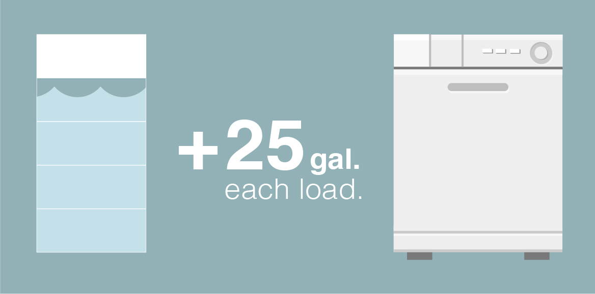 Dishwashing and laundry are two of the biggest water-consuming activities in any household. But by choosing to wash only full loads, you can make remarkable reductions: 15 – 45 gallons per load of laundry and 5 - 15 gallons per load of dishes.